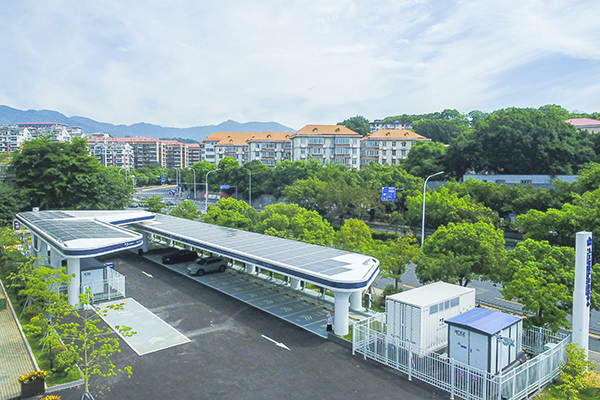 作为城市分布式储能的重要示范应用案例,福州鼓楼城投铜盘路光储充检智能超充站安装有94.6kWp光伏发电系统,并配置了824kWh储能箱。光伏发电系统能够结合储能系统、充电系统,实现光、储、充协调运用,提升清洁能源的消纳利用。除此之外,由于采用了全直流微网技术,超充站相当于一个微电网,即便多台车辆同时高功率充电,也不会对公共电网造成用电负荷,甚至还能利用储能系统参与调频、调压,改善电能质量,缓解城市中心区充电基础设施增容、扩容的压力,达到削峰填谷、调频调峰的作用,增强了电网的可靠性。